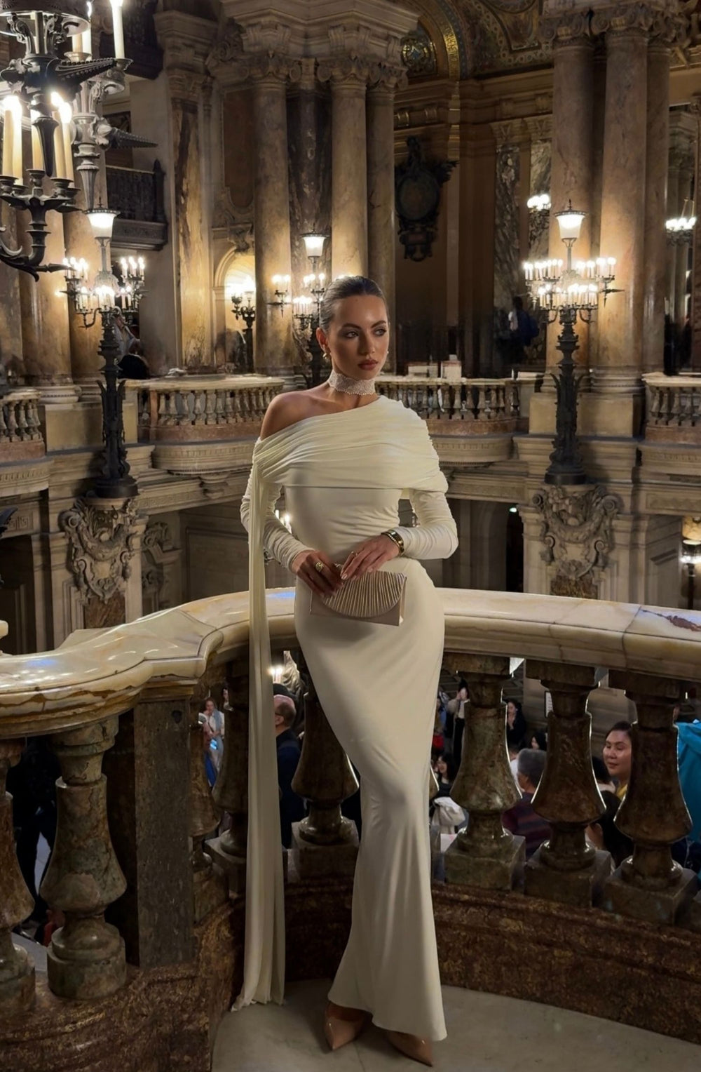 First up, color. Are bright hues appropriate? How do you make neutrals feel exciting? As a general rule, earthy, jewel or muted tones work best for a black-tie event. When in doubt, think about the shades Audrey Hepburn or Grace Kelly would have worn, that’s always a safe bet. Our team loves a classic white, navy, red or black dress for timeless sophistication. That said, we get that they can feel a little safe (or even stuffy). To elevate these staple shades, look for a gown with draping, rouching or an interesting neckline for a chic twist on the black-tie evening dress.
