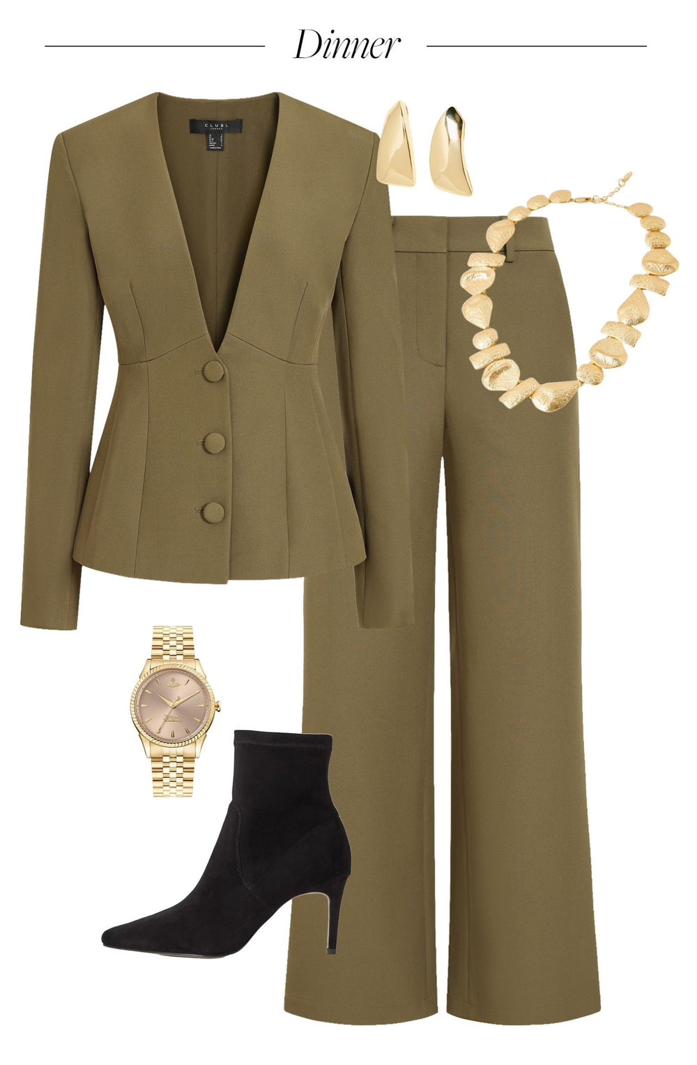 After dark, bring a new energy to your power suit through considered layering. Introduce statement jewelry, such as a mixture of gold necklaces that highlight the drop neckline, and finish with your favourite boots that can handle city pavements with ease. This ensures your look is perfectly suited to an evening agenda.