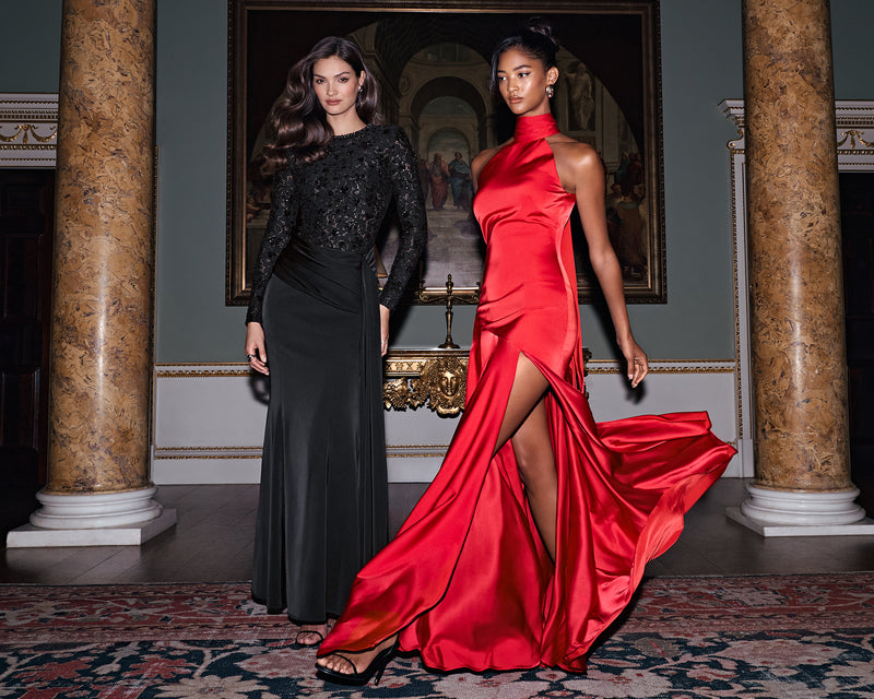 Cameras capture the shimmer of your hand-embellished gown. Eclipse's velvet and sequin dresses in burgundy and black offer head-turning sophistication.